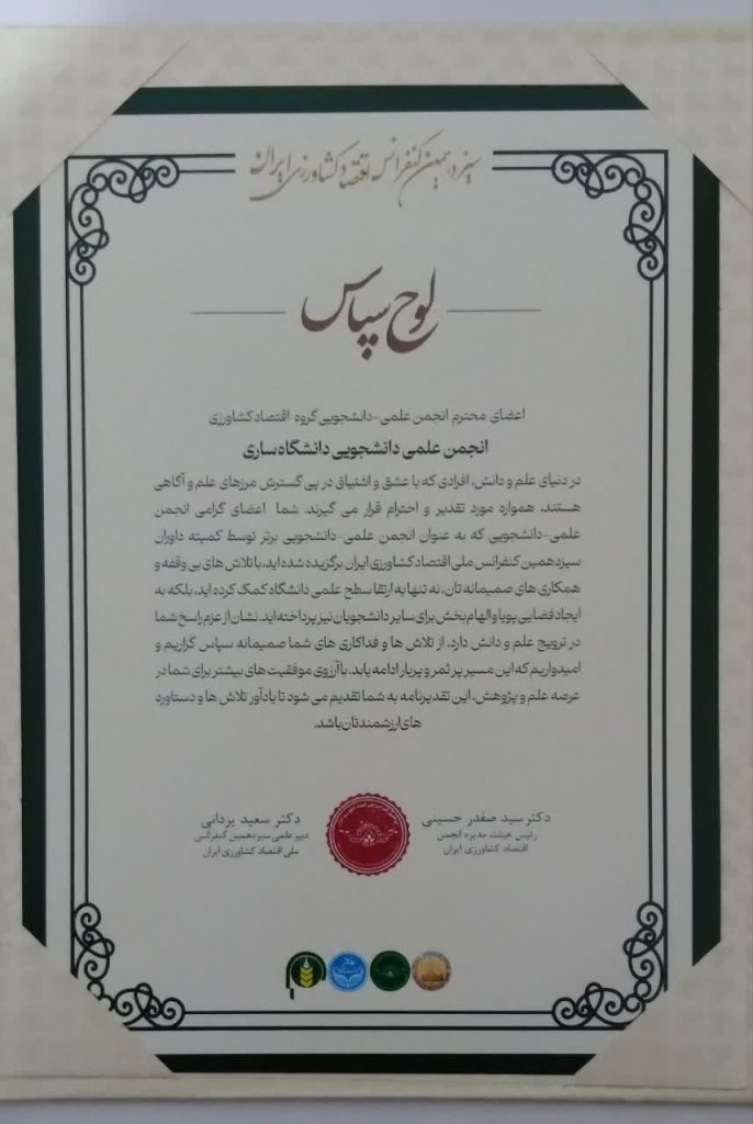 کسب عنوان انجمن علمی برتر اقتصاد کشاورزی توسط انجمن علمی اقتصاد کشاورزی دانشگاه علوم کشاورزی و منابع طبیعی ساری